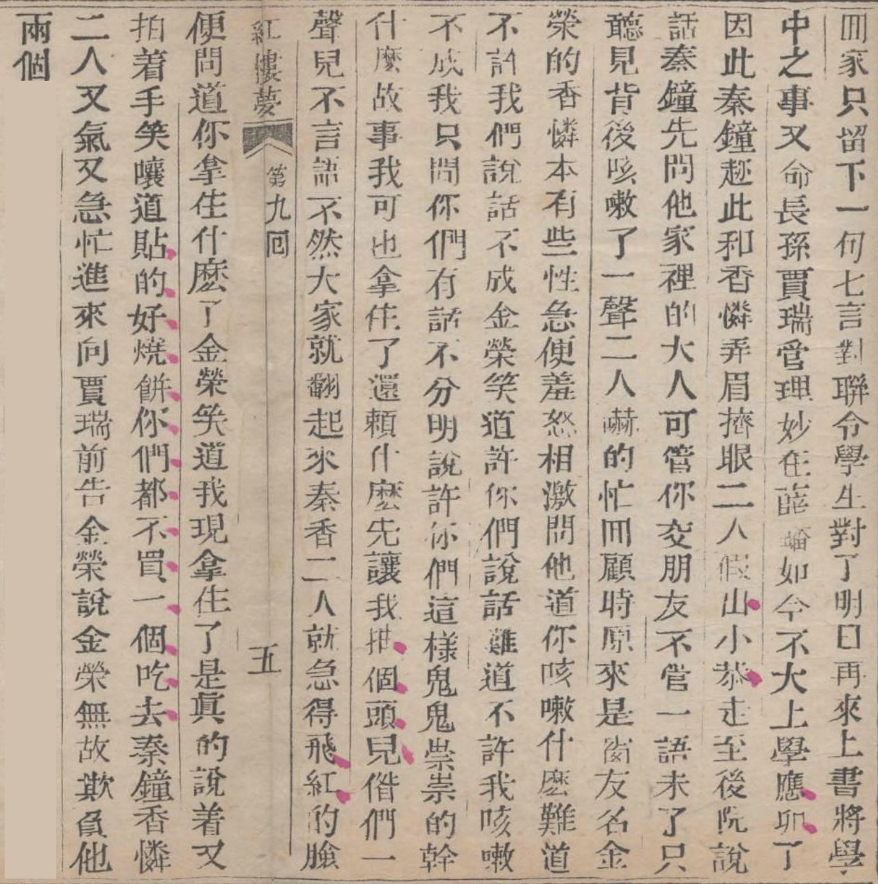 可巧這日代儒有事回家,只留下一句七言對聯,令學生對了,明日再來上書;將學中之事又命長孫賈瑞管理。妙在薛蟠如今不大上學應卯了,因此,秦鍾趁此和香憐弄眉擠眼,二人假出小恭,走至後院說話。秦鍾先問他:「家裡的大人可管你交朋友不管?」一語未了,只聽見背後咳嗽了一聲。二人嚇的忙回顧時,原來是窗友名金榮的。香憐本有些性急,便羞怒相激,問他道:「你咳嗽什麼?難道不許我們說話不成?」金榮笑道:「許你們說話,難道不許我咳嗽不成?我只問你們,有話不分明說,許你們這樣鬼鬼祟祟的幹什麼故事?我可也拿住了!還賴什麼?先讓我抽個頭兒,咱們一聲兒不言語;不然,大家就翻起來!」秦香二人就急得飛紅的臉,便問道:「你拿住什麼了?」金榮笑道:「我現拿住了是真的!」說著,又拍著手笑嚷道:「貼的好燒餅!你們都不買一個吃去?」秦鍾香憐二人又氣又急,忙進來向賈瑞前告金榮,說金榮無故欺負他兩個。