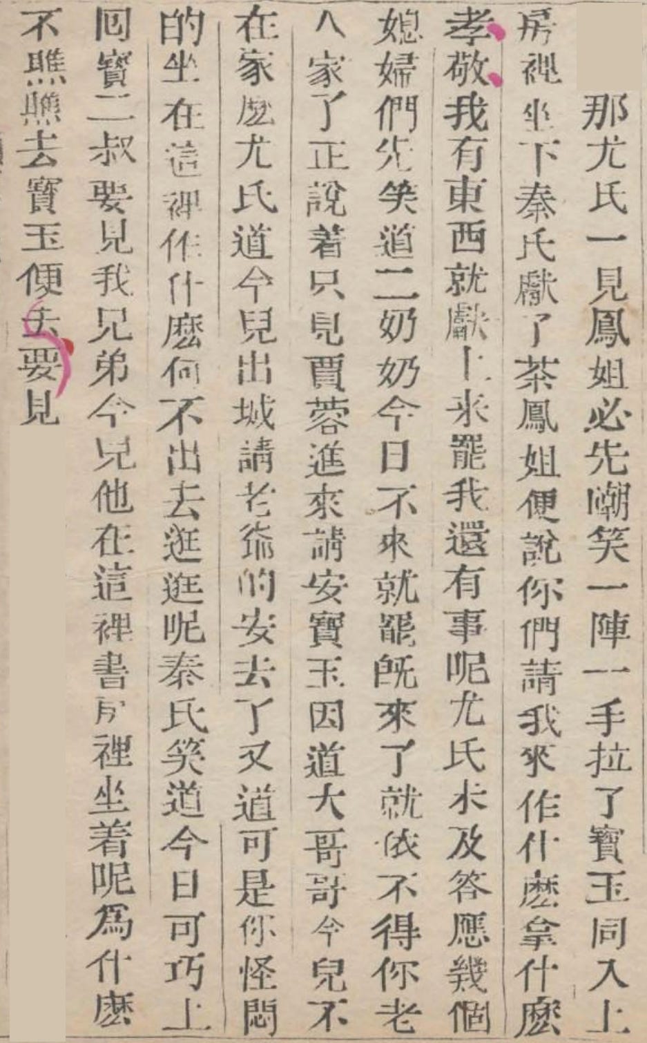 那尤氏一見了鳳姐,必先嘲笑一陣,一手拉了寶玉,同入上房裡坐下。秦氏獻了茶。鳳姐便說:「你們請我來作什麼?拿什麼孝敬我?有東西就獻上來罷,我還有事呢。」尤氏未及答應,幾個媳婦們先笑道:「二奶奶,今日不來就罷;既來了,就依不得你老人家了。」正說著,只見賈蓉進來請安。寶玉因道:「大哥哥今兒不在家麼?」尤氏道:「今兒出城請老爺的安去了。」又道:「可是你怪悶的,坐在這裡作什麼?何不出去逛逛呢?」秦氏笑道:「今日可巧。上回寶二叔要見我兄弟,今兒他在這裡書房裡坐著呢。為什麼不瞧瞧去?」寶玉便要去見。