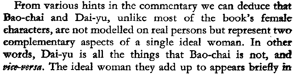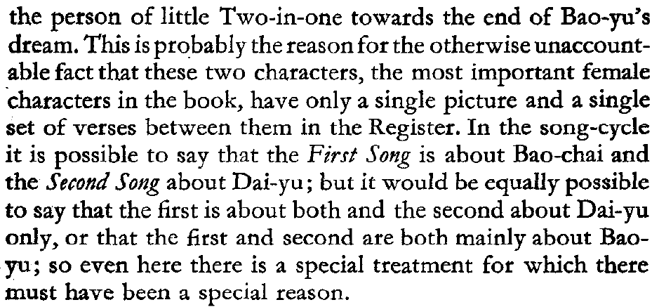 Well, David Hawkes believed that this was a sign that Xue Baochai and Lin Daiyu were the “perfect woman” divided into half:
