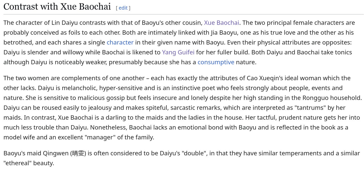 The problem, however, is that this is not necessarily true. It’s not necessarily the case that Lin Daiyu and Xue Baochai were conceived to be “the perfect woman” divided into two, nor is it likely true that the characters were designed to be foils of each other.