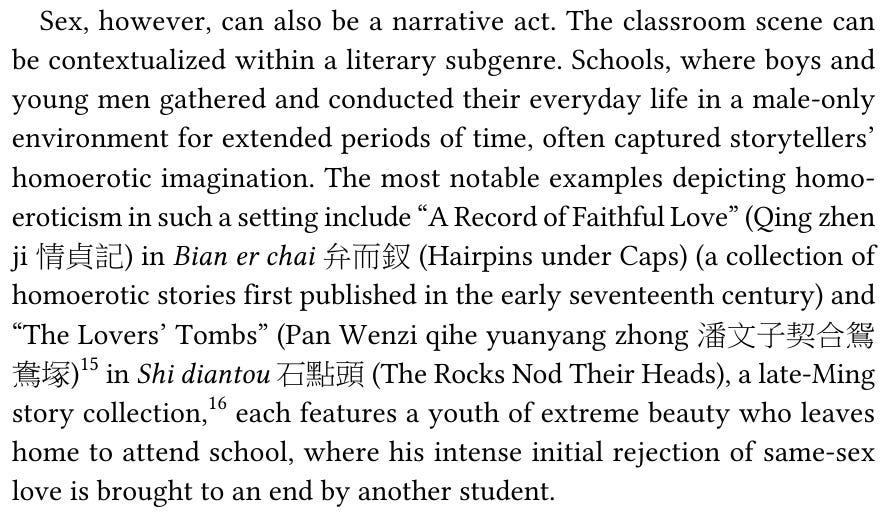 And, you know, the nice thing about reading these scholarly studies is that the scholars tend to do the hard work for the rest of us. I can always just take Professor Wu at her word instead of trying to track down these collections of homoerotic stories that she’s citing.