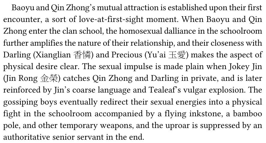 Back in 2017, Professor I-Hsien Wu wrote a book called Eroticism and Other Literary Conventions in Chinese Literature: Intertextuality in The Story of the Stone. You can’t go wrong with a name like that, right? Anyway, despite the lack of a punchy book name, it’s an interesting study, and includes this nice and terse description of the relationship between Jia Baoyu and Qin Zhong: