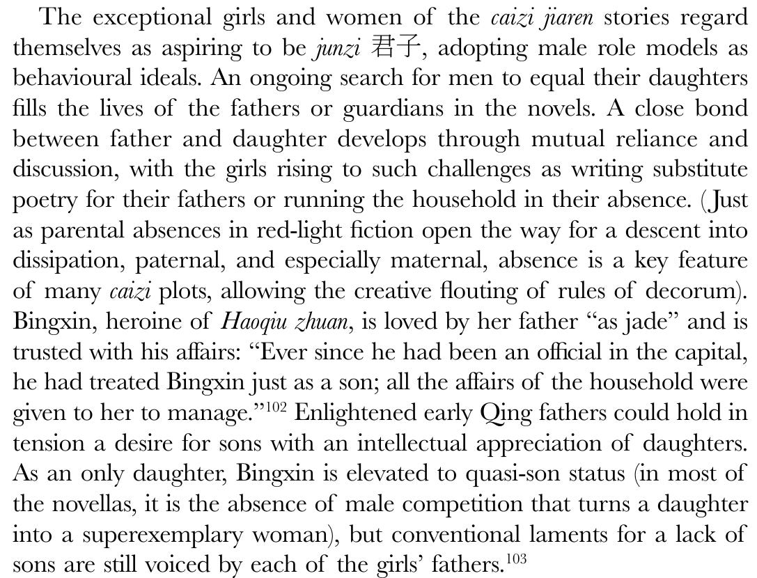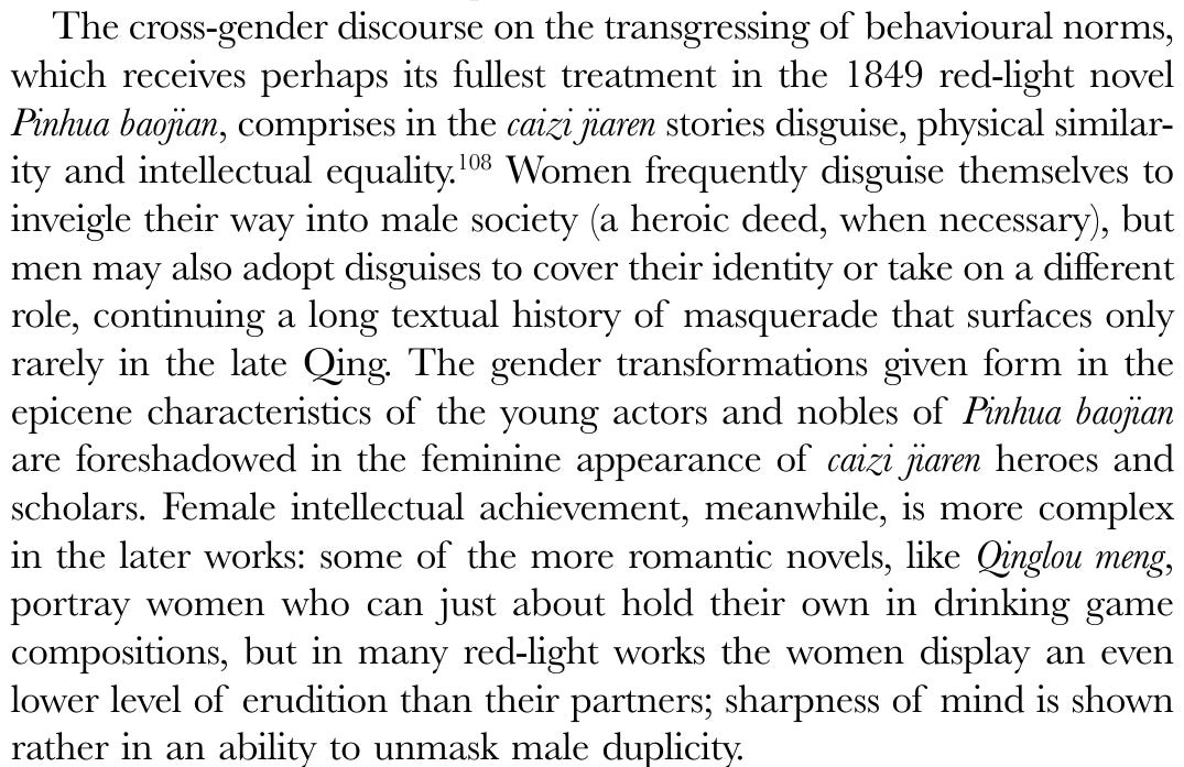 One more “queer” note. It’s actually common in the “great scholar and beautiful woman” stories to see women who aspire to be like men. This comes from Chloe F. Starr’s excellent Red-light Novels of the late Qing: