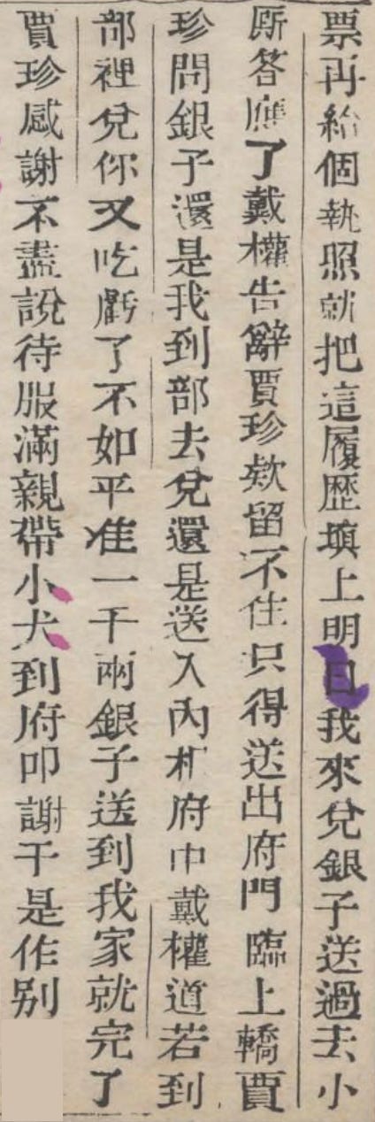 戴權看了,回手遞與一個貼身的小廝收了,道:「回去送與戶部堂官老趙,說我拜上他起一張五品龍禁尉的票,再給個執照,就把這履歷填上,明日我來兌銀子送過去。」小廝答應了。戴權告辭,賈珍款留不住,只得送出府門。臨上轎,賈珍問:「銀子還是我到部去兌,還是送入內相府中?」戴權道:「若到部裡兌,你又吃虧了;不如平準一千兩銀子送到我家就完了。」賈珍感謝不盡,說:「待服滿,親帶小犬到府叩謝。」於是作別。