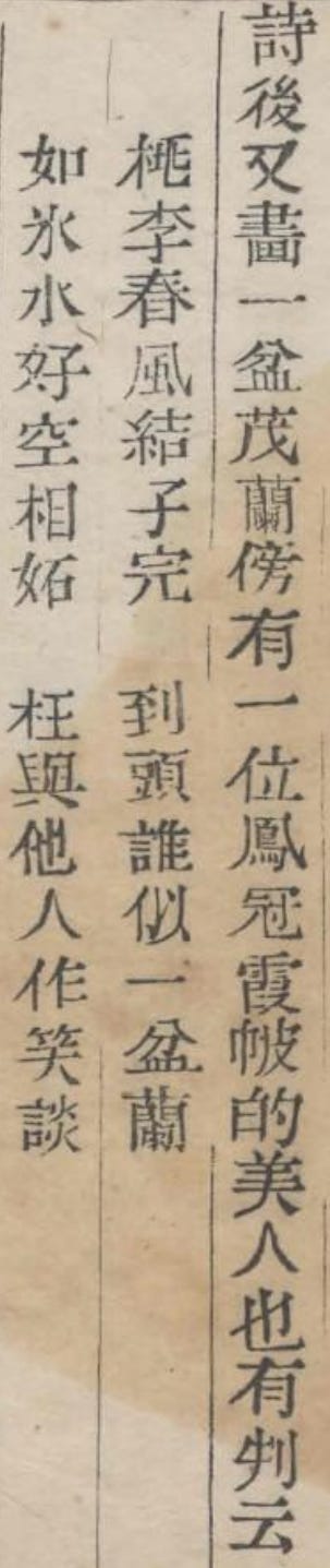 詩後又畫一盆茂蘭。旁有一位鳳冠霞帔的美人。也有判云: