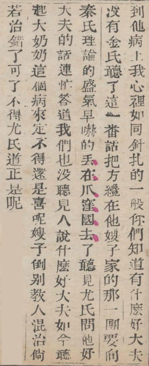 金氏聽了這一番話,把方才在他嫂子家的那一團要向秦氏理論的盛氣,早嚇的丟在「爪窪國」去了。聽見尤氏問他好大夫的話,連忙答道:「我們也沒聽見人說什麼好大夫。如今聽起大奶奶這個病來,定不得還是喜呢。嫂子倒別叫人混治,倘若治錯了,可了不得!」尤氏道:「正是呢。」