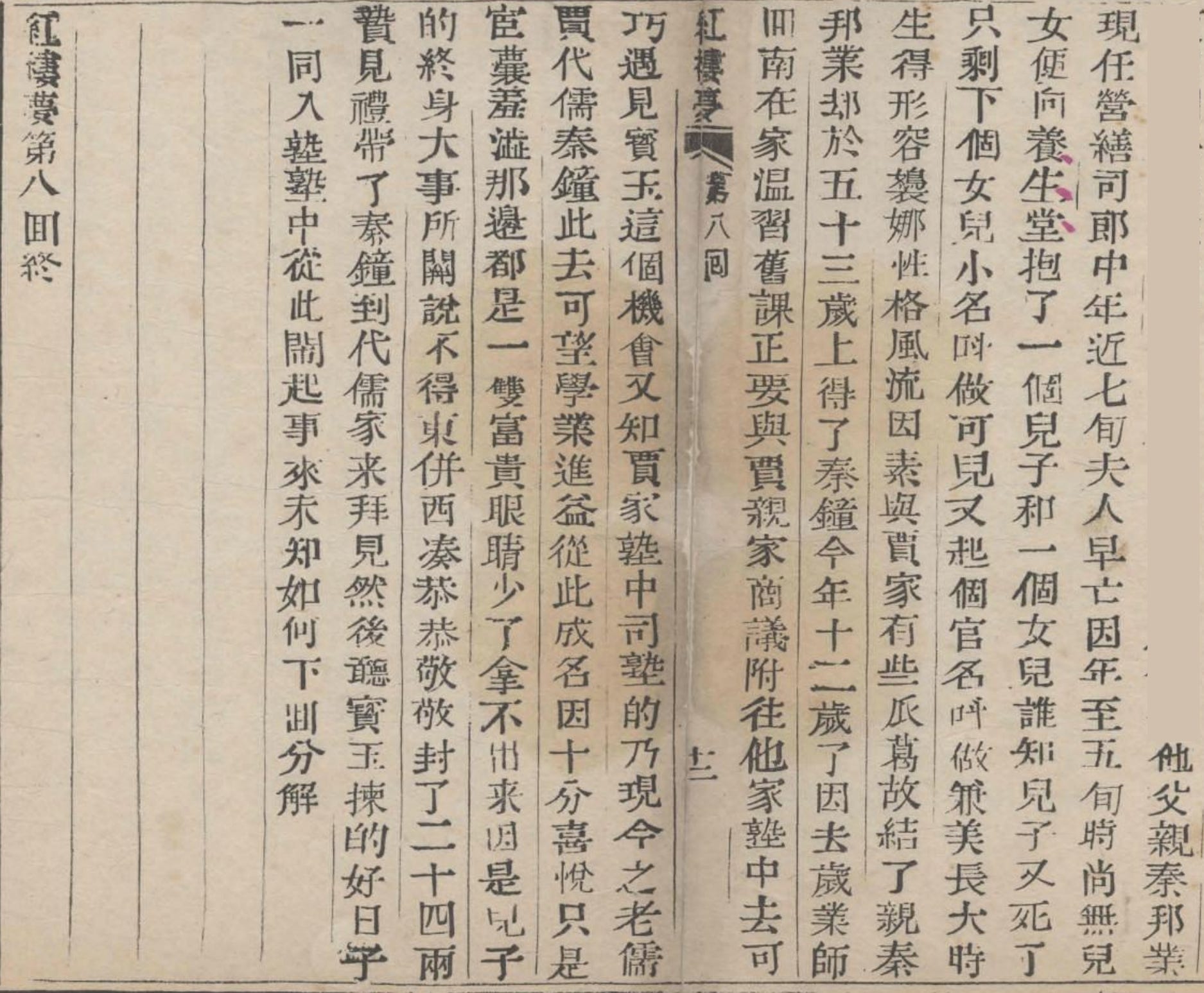 秦邦業卻於五十三歲上得了秦鍾,今年十二歲了。因去歲業師回南,在家溫習舊課,正要與賈親家商議,附往他家塾中去。可巧遇見寶玉這個機會,又知賈家塾中司塾的乃現今之老儒賈代儒,秦鍾此去,可望學業進益,從此成名,因十分喜悅。只是宦囊羞澀,那邊都是一雙富貴眼睛,少了拿不出來,因是兒子的終身大事所關,說不得東拼西湊,恭恭敬敬封了二十四兩贄見禮,帶了秦鍾,到代儒家來拜見,然後聽寶玉揀的好日子一同入塾。塾中從此鬧起事來。