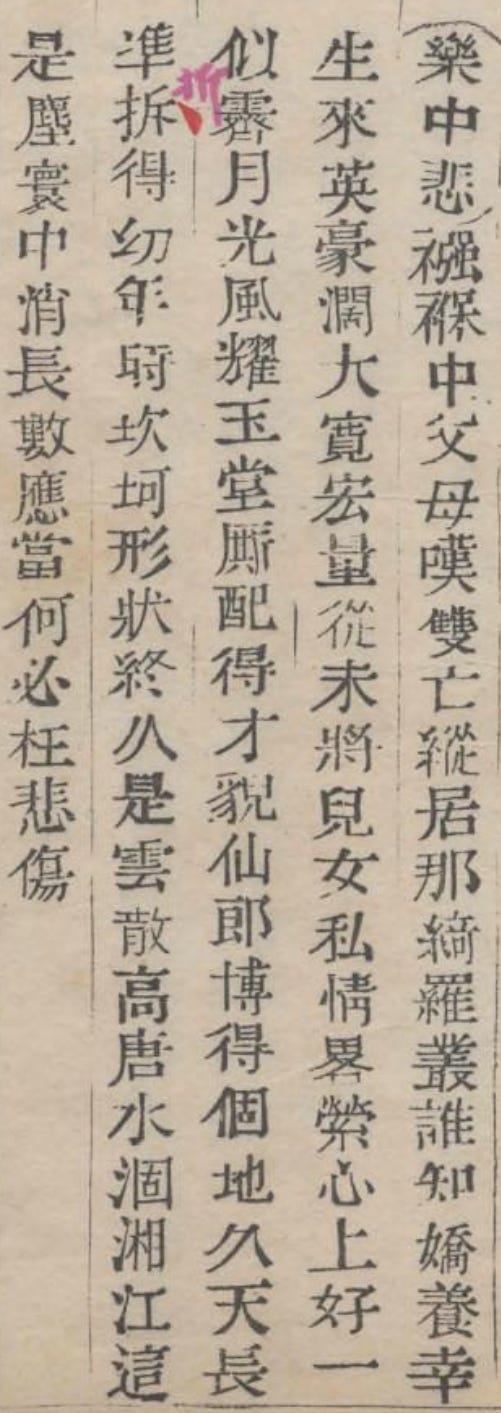 襁褓中,父母嘆雙亡。縱居那綺羅叢,誰知嬌養?幸生來英豪闊大寬巨集量,從未將兒女私情略縈心上,好一似霽月光風耀玉堂。廝配得才貌仙郎,博得個地久天長,准折得幼年時坎坷形狀。終久是雲散高唐,水涸湘江:這是塵寰中消長數應當,何必枉悲傷?