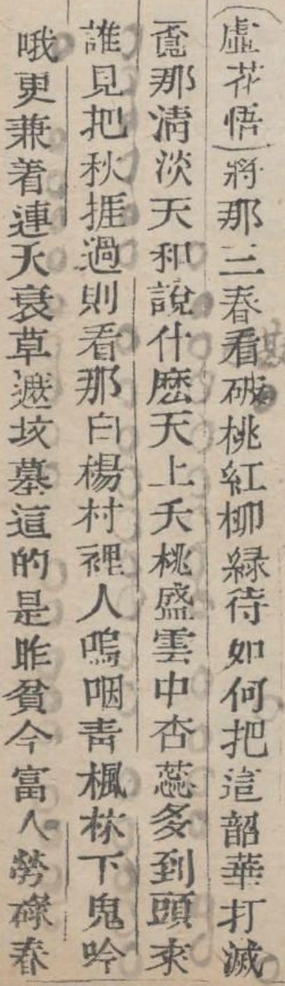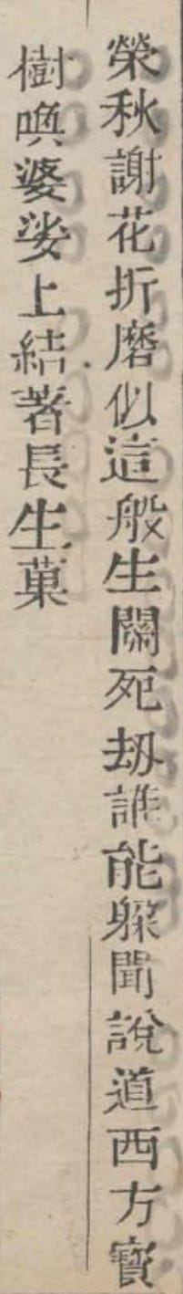 將那三春看破,桃紅柳綠待如何?把這韶華打滅,覓那清淡天和。說什麼天上夭桃盛,雲中杏蕊多?到頭來,誰見把秋捱過?則看那白楊村裡人嗚咽,青楓林下鬼吟哦,更兼著連天衰草遮墳墓。這的是昨貧今富人勞碌,春榮秋謝花折磨。似這般生關死劫誰能躲?聞說道西方寶樹喚婆娑,上結著長生果。