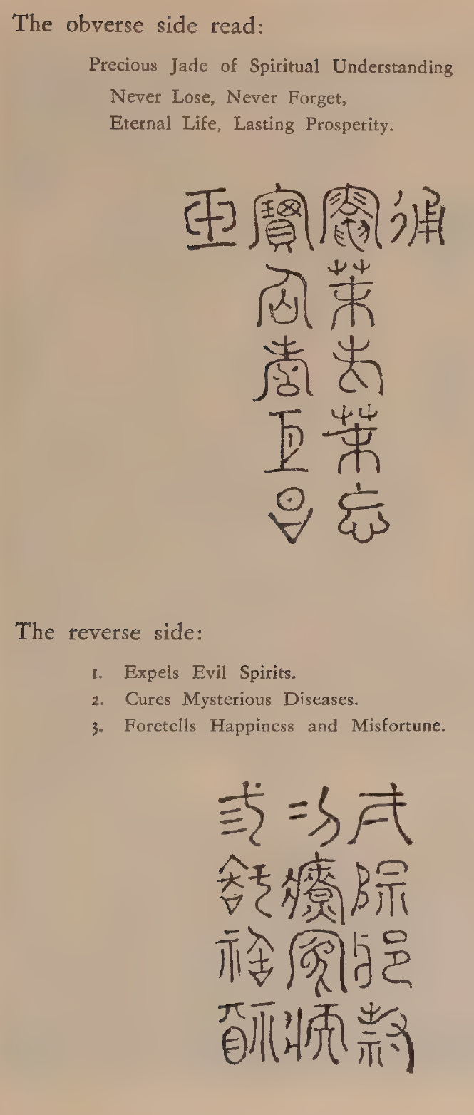 As you can see in the Chinese text above, the inscriptions on the amulets were written in seal script in the original text. It’s ornate and is not very easy to read. Most Chinese versions of the text you’ll find online inadvertently omit the inscription on the back side of Jia Baoyu’s jade. This is because most Chinese printings of the text present that text only as a photo of the seal script. Fortunately, there are some Chinese editions that also print more readable versions of the characters, such as this one: