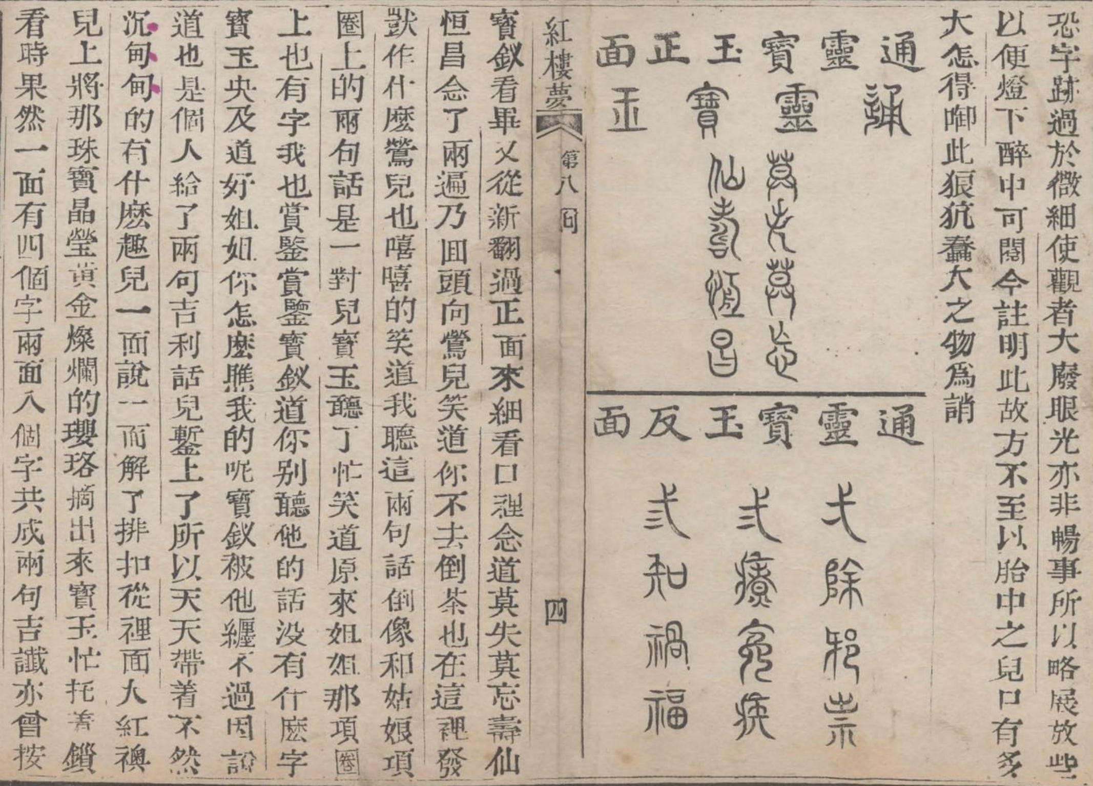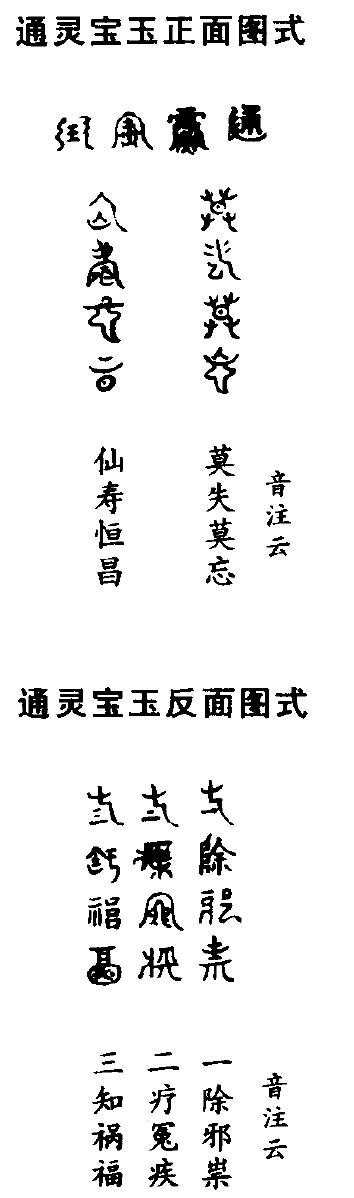 那頑石亦曾記下他這幻相併癩僧所鐫篆文,今亦按圖畫於後面。但其真體最小,方從胎中小兒口中銜下,今若按式畫出,恐字跡過於微細,使觀者大費眼光,亦非暢事。所以略展放些,以便燈下醉中可閱。今註明此故,方不至以胎中之兒口有多大,怎得銜此狼犺蠢大之物為誚。
