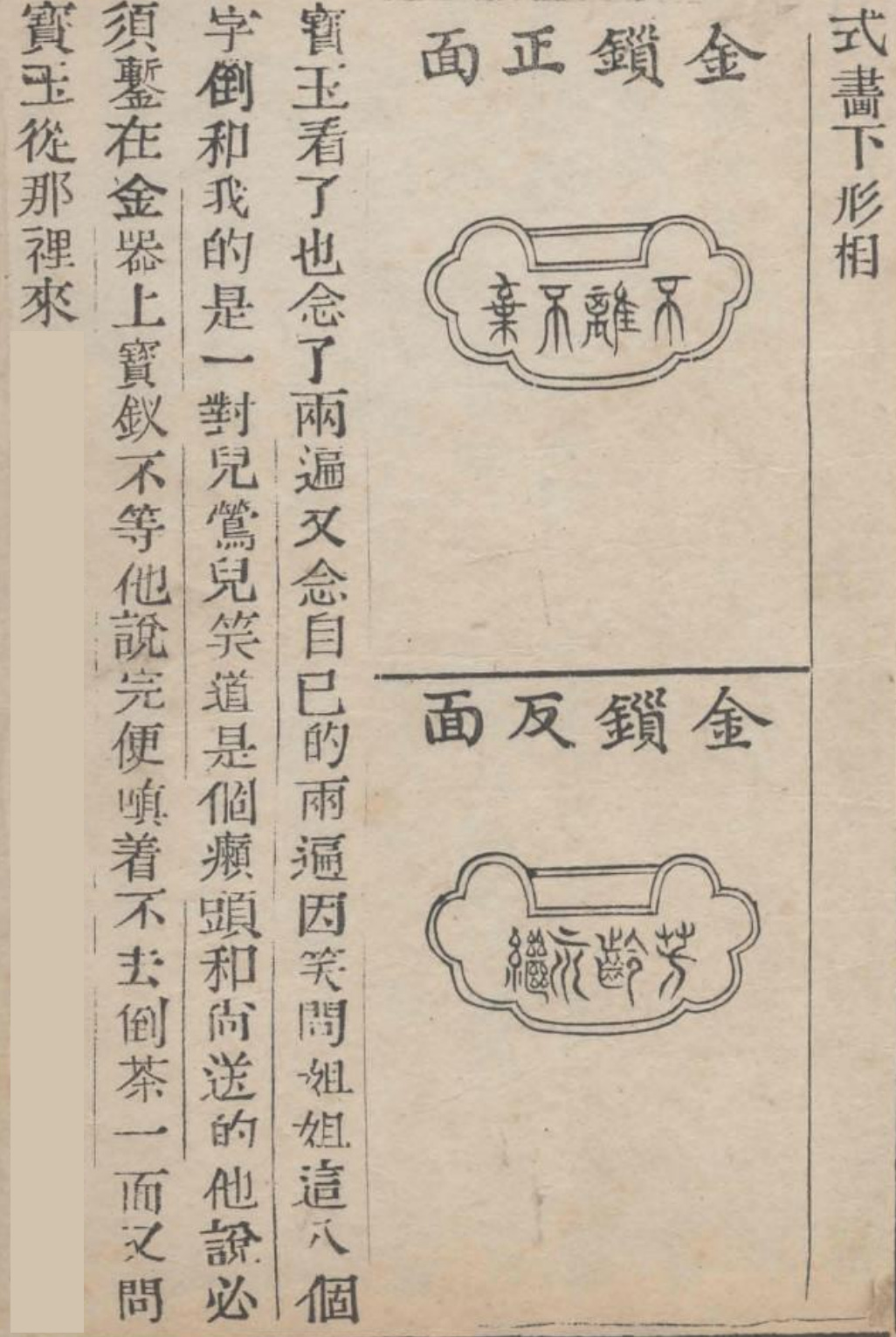 寶玉聽了,忙笑道:「原來姐姐那項圈上也有字?我也賞鑑賞鑑。」寶釵道:「你別聽他的話,沒有什麼字。」寶玉央及道:「好姐姐,你怎麼瞧我的呢?」寶釵被他纏不過,因說道:「也是個人給了兩句吉利話兒鏨上了,所以天天帶著;不然,沉甸甸的,有什麼趣兒?」一面說,一面解了排扣,從裡面大紅襖兒上將那珠寶晶瑩黃金燦爛的瓔珞摘出來。寶玉忙托著鎖看時,果然一面有四個字,兩面八個字,共成兩句吉讖,亦曾按式畫下形相: