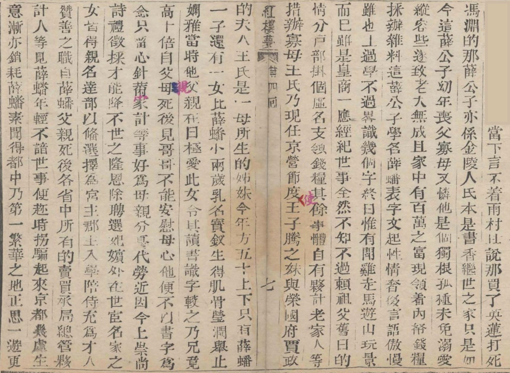 當下言不著雨村。且說那買了英蓮打死馮淵的那薛公子亦系金陵人氏,本是書香繼世之家。只是如今這薛公子幼年喪父,寡母又憐他是個獨根孤種,未免溺愛縱容些,遂致老大無成。且家中有百萬之富,現領著內帑錢糧,採辦雜料。這薛公子,學名薛蟠,表字文起,性情奢侈,言語傲慢;雖也上過學,不過略識幾個字,終日惟有鬥雞走馬,遊山玩水而已。雖是皇商,一應經紀世事全然不知,不過賴祖父舊日的情分,戶部掛個虛名,支領錢糧,其餘事體自有夥計老家人等措辦。寡母王氏乃現任京營節度使王子騰之妹,與榮國府賈政的夫人王氏是一母所生的姊妹,今年方五十上下,只有薛蟠一子。還有一女比薛蟠小兩歲,乳名寶釵,生得肌骨瑩潤,舉止嫻雅。當時他父親在日,極愛此女,令其讀書識字,較之乃兄竟高十倍。自父親死後,見哥哥不能安慰母心,他便不以書字為念,只留心針黹家計等事,好為母親分憂代勞。近因今上崇尚詩禮,徵採才能,降不世之隆恩,除聘選妃嬪外,在世宦名家之女,皆得親名達部,以備選擇為公主郡主入學陪侍,充為才人贊善之職。自薛蟠父親死後,各省中所有的買賣承局總管夥計人等,見薛蟠年輕,不諳世事,便趁時拐騙起來,京都幾處生意漸亦銷耗。