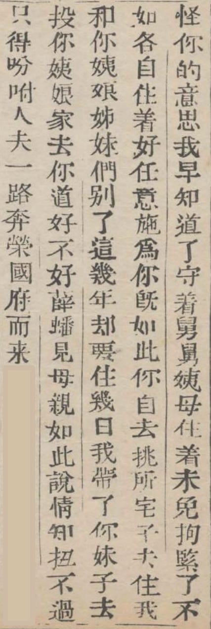 Hawkes also has Xue Pan’s mother ask him whyever, an emphatic form of “why” that almost never shows up in conversation. This is utterly bizarre considering how casual the conversation is in Chinese: notice the constant use of 咱們 and other casual phrases.