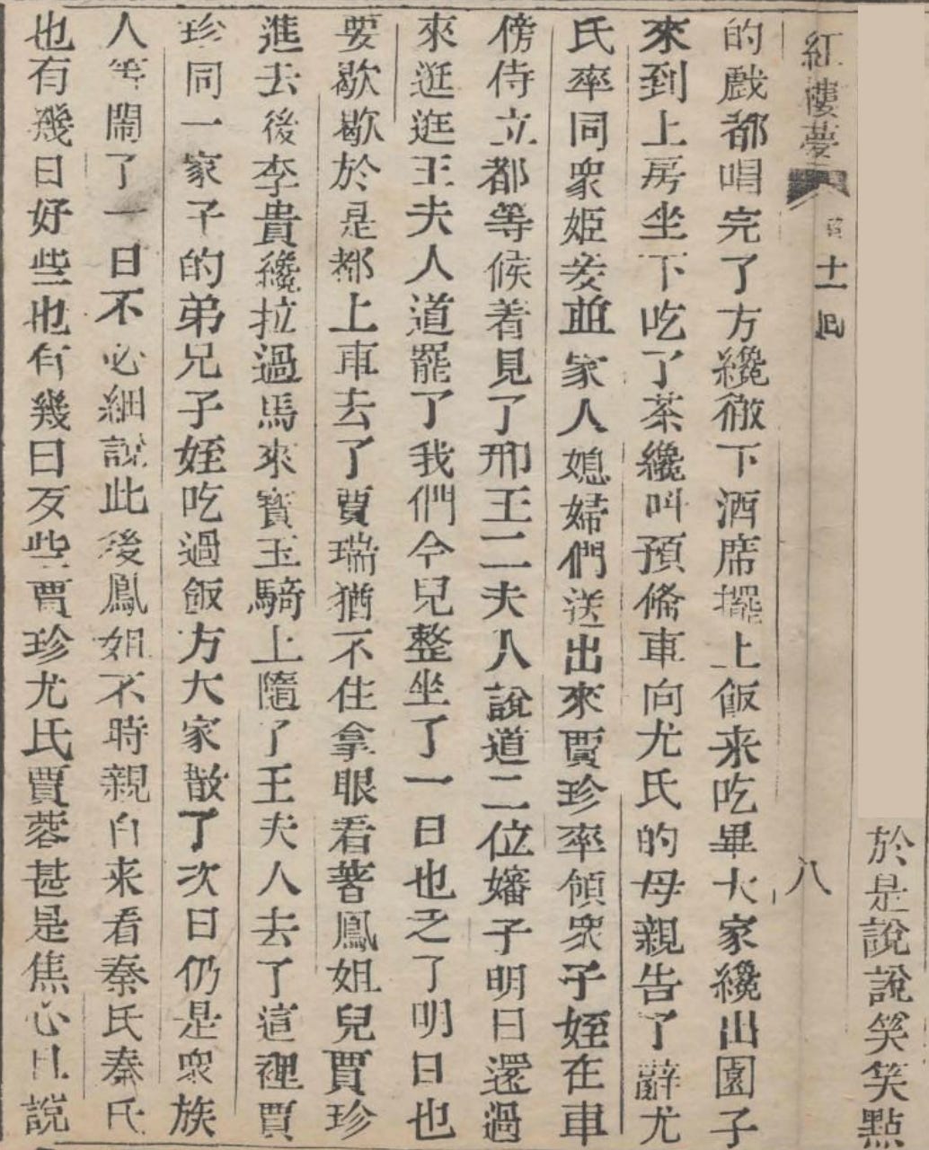 This brief excerpt is a transition passage, and is actually pretty simple. However, Cao Xueqin reminds us of the unrequited love that Jia Rui apparently feels for Wang Xifeng.