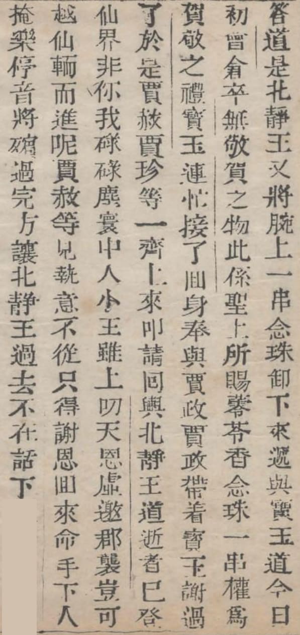 北靜王又將腕上一串念珠卸下來,遞與寶玉,道:「今日初會,倉卒無敬賀之物,此係聖上所賜蕶苓香念珠一串,權為賀敬之禮。」寶玉連忙接了,回身奉與賈政。賈政帶著寶玉謝過了。於是賈赦賈珍等一齊上來叩請回輿。北靜王道:「逝者已登仙界,非你我碌碌塵寰中人。小王雖上叨天恩,虛邀郡襲,豈可越仙輀而進呢?」賈赦等見執意不從,只得謝恩回來,命手下人掩樂停音,將殯過完,方讓北靜王過去。不在話下。
