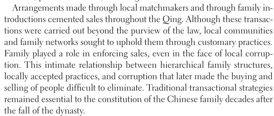 Per Professor Ransmeier, the practice was much more complex than even Cao Xueqin described. Not only were there numerous wealthy households that kept 婢女 (bìnǚ, or slave girls), as Cao Xueqin clearly describes, but there was also a frightening and difficult to read trend of selling child brides.