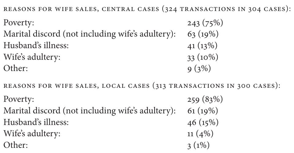 There’s another great book on a similar subject by Stanford Professor Matthew H. Sommer called Polyandry and Wife-Selling in Qing Dynasty China. Though Professor Sommer chiefly investigates court cases from specific counties in modern Sichuan Province, it seems that the cases he found were pretty common throughout the entire Qing Dynasty. It might seem hard to believe today, but it was not all that rare for husbands to sell their own wives for a variety of reasons:
