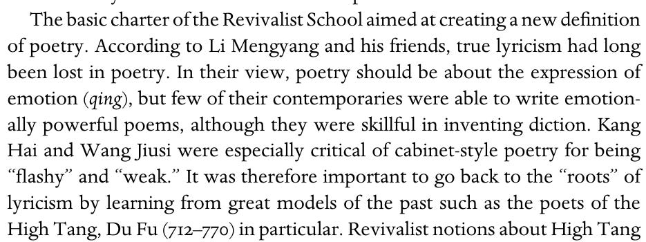 It turns out that discussions around 情 were common in Chinese literary circles in the two centuries or so before Dream of the Red Chamber was first published. For example, there was the so-called “Revivalist movement” (復古, or “reviving antiquity”) of the late 15th and early 16th centuries: