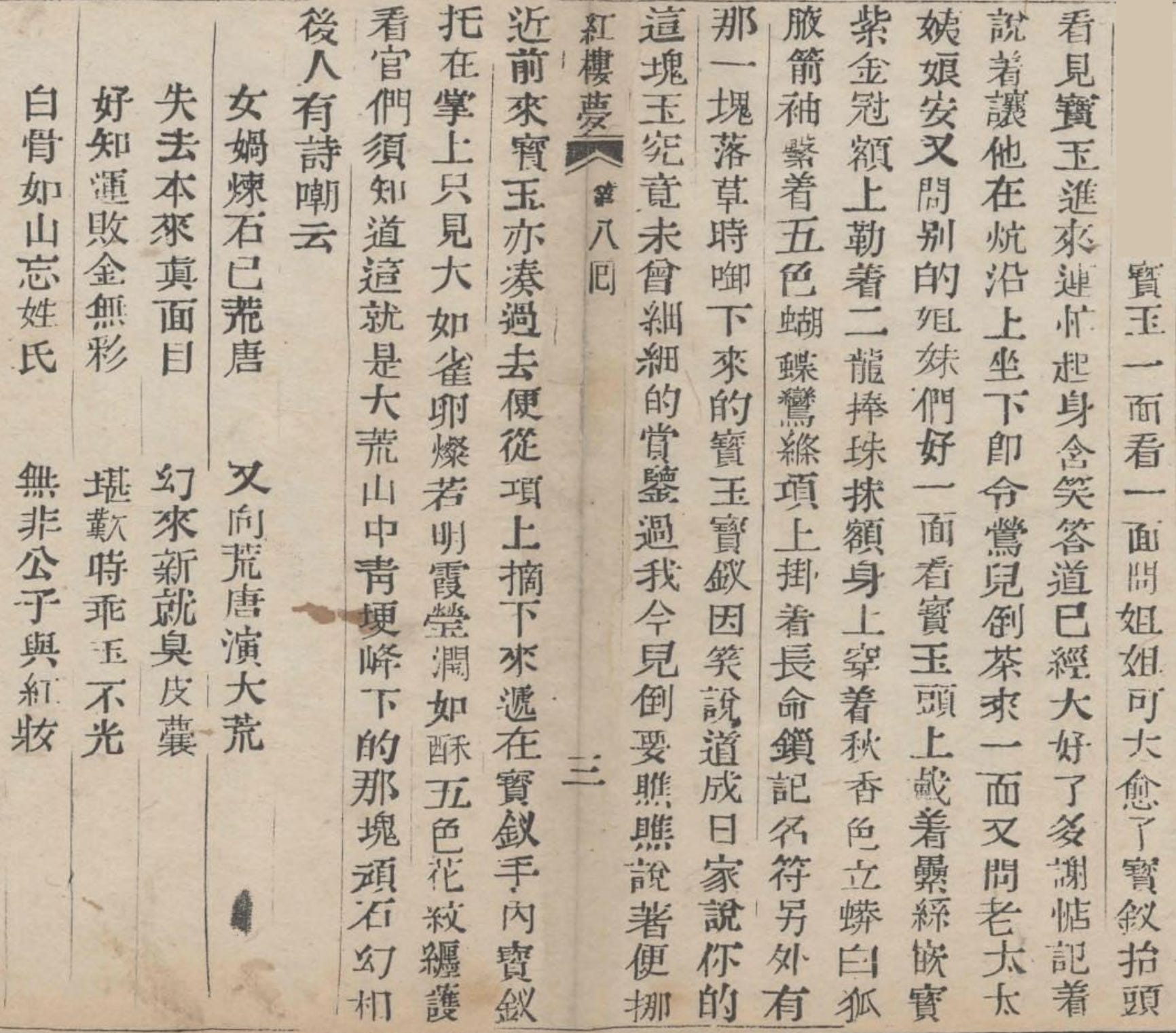 Xue Baochai has a chance to take a close look at Jia Baoyu’s jade in this passage. This includes a poem that is difficult to understand, but is filled with the sort of symbolism that characterizes this novel.