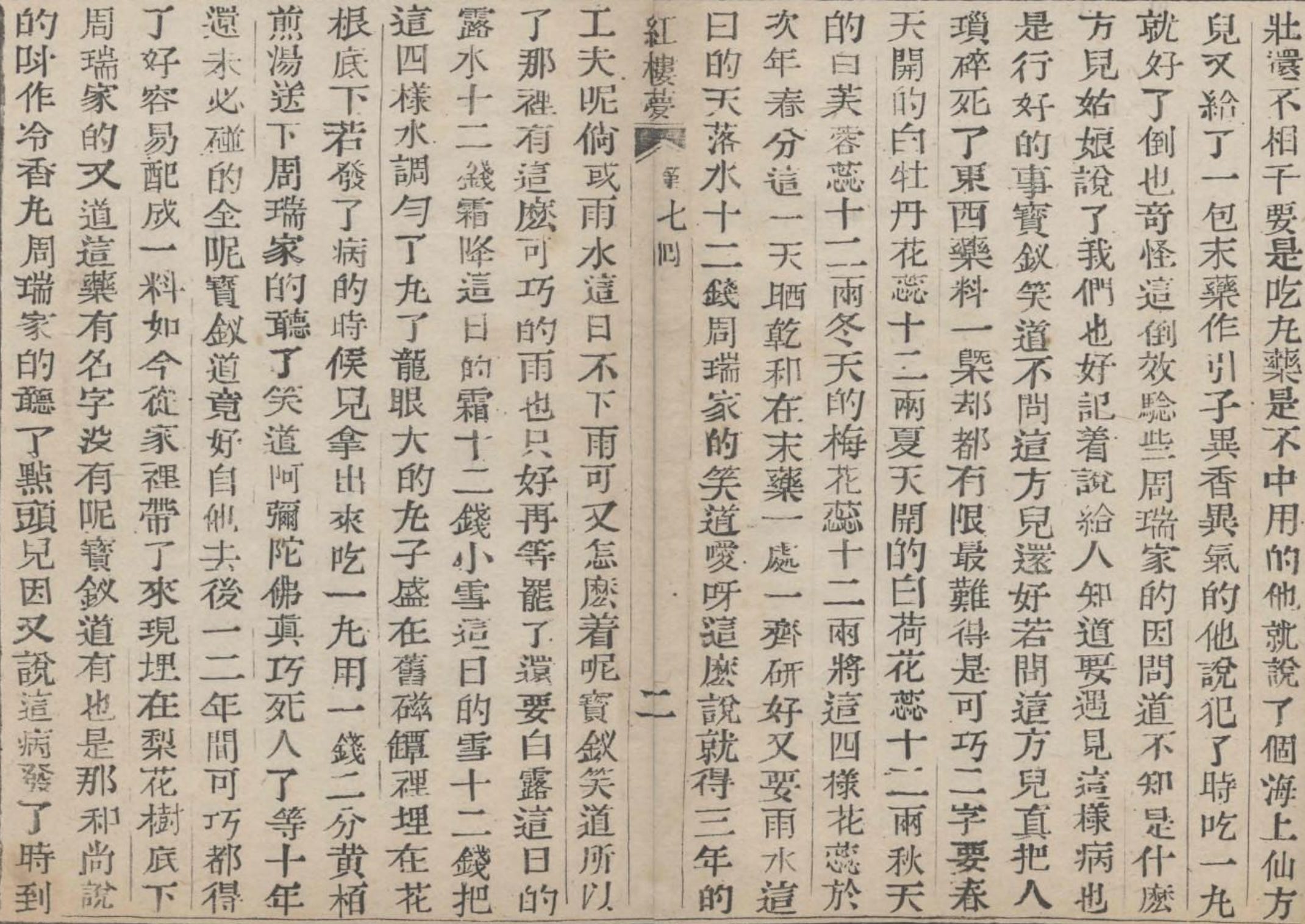 周瑞家的因問道:「不知是什麼海上方兒?姑娘說了,我們也好記著,說給人知道。要遇見這樣病,也是行好的事。」寶釵笑道:「不問這方兒還好,若問這方兒,真把人瑣碎死了。東西藥料一概卻都有限,最難得是『可巧』二字。要春天開的白牡丹花蕊十二兩,夏天開的白荷花蕊十二兩,秋天的白芙蓉花蕊十二兩,冬天的白梅花蕊十二兩。將這四樣花蕊於次年春分這一天晒乾,和在末藥一處,一齊研好。又要雨水這日的天落水十二錢。」周瑞家的笑道:「噯呀,這麼說就得三年的工夫呢!倘或雨水這日不下雨,可又怎麼著呢?」寶釵笑道:「所以了,那裡有這麼可巧的雨?也只好再等罷了。還要白露這日的露水十二錢,霜降這日的霜十二錢,小雪這日的雪十二錢。把這四樣水調勻了,丸了龍眼大的丸子,盛在舊磁壇裡,埋在花根底下。若發了病的時候兒,拿出來吃一丸,用一錢二分黃柏煎湯送下。」